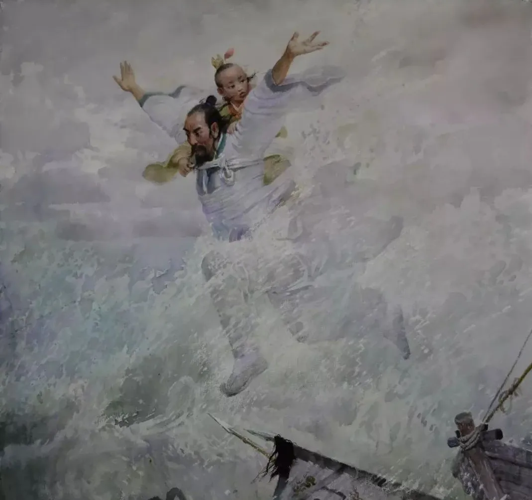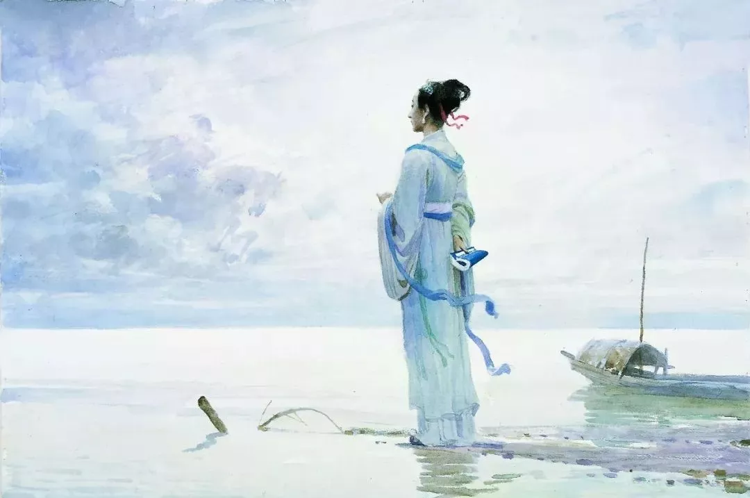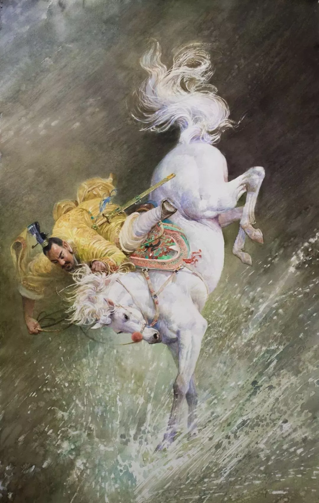 作为一个异乡的游子,一个双重文化视角的画家,黄中羊对英国拉斐尔前派的绘画情有独钟。他仿佛在艺术中找到更多与拉斐尔前派的共同之处,即从本民族的历史、文学、宗教及戏剧等领域中寻找创作源泉,更好地寄情寓意。从他的作品《萧何月下追韩信》、《吴起杀妻求将》中,一个中国画家的怀乡情怀在水彩画中得以深沉流露。