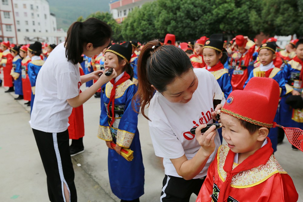 表演前,小学生化妆。